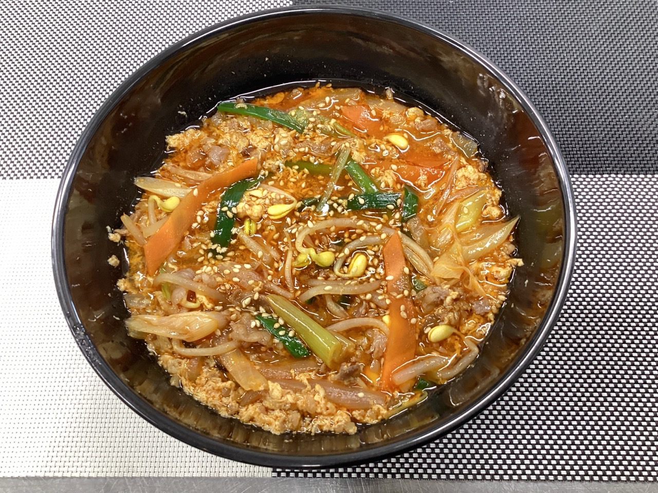 ユッケジャンスープは、牛肉と様々な野菜(もやしやワラビなど)が入った、辛みのある韓国のスープ料理です。
