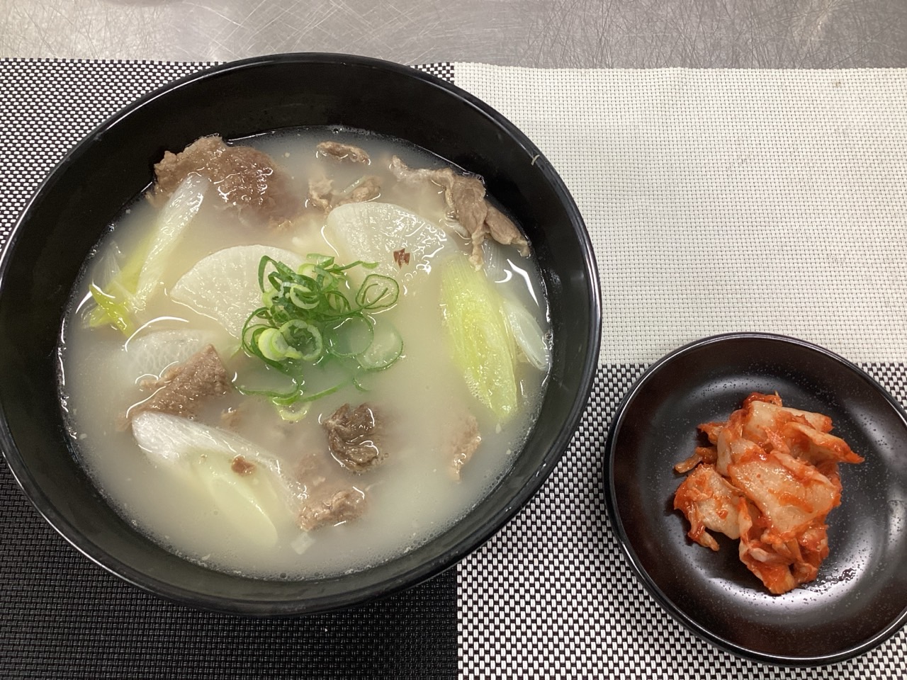 定番の大根を煮込み、キムチをトッピングに、少しのご飯を忍ばせてクッパ風のソルロンタンの出来上がりです✨