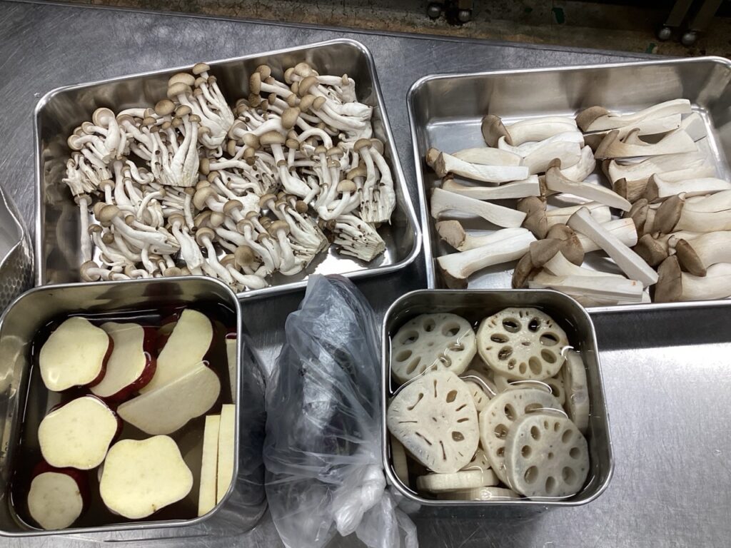秋野菜としては蓮根、茄子、さつまいもにしめじにエリンギを用意しました。