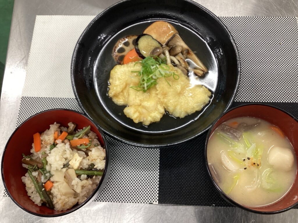 秋野菜と鶏むねの揚げ出し+山菜おこわ+里芋とねぶかのお味噌汁(白味噌仕立て)