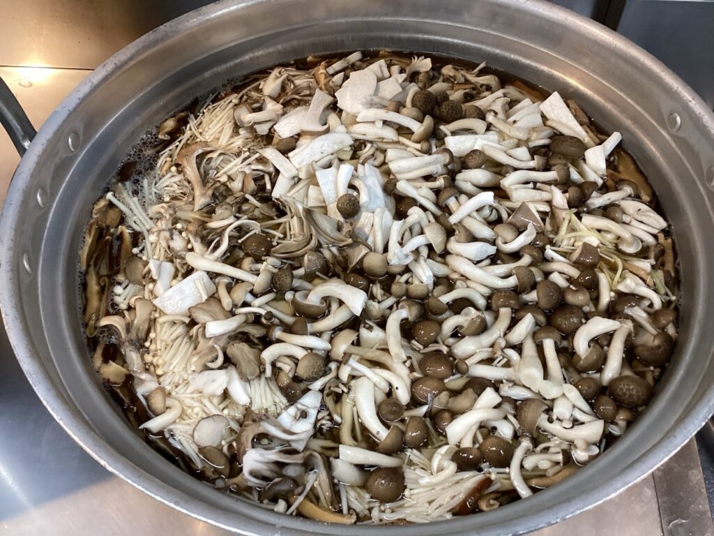 甘辛く炊いた豚肉に、きのこは椎茸、しめじ、えのきにエリンギをドサッと🍄