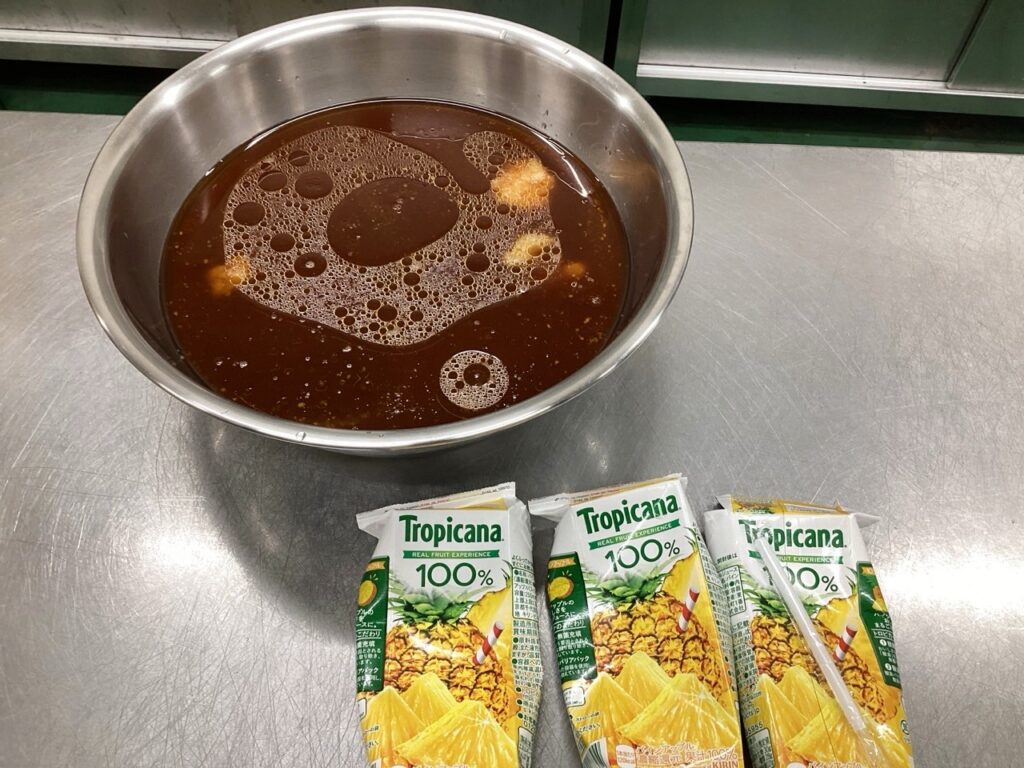 特徴的なのは漬けダレにパイナップルジュースを使っているということで、