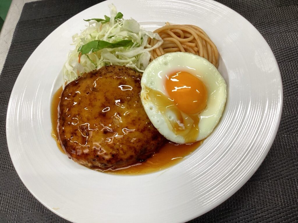 これは定番、というかちょっと贅沢なハンバーグメニューといった感じですね(なにせ目玉焼きがつく😍)